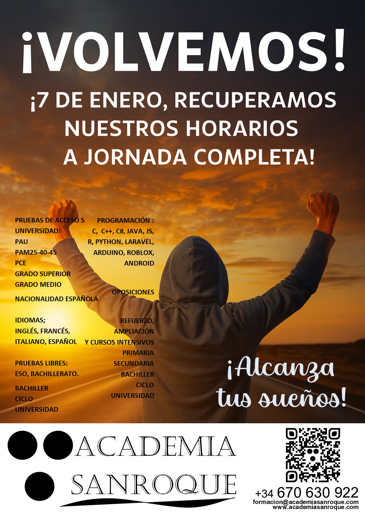 Tras el merecido descanso navideño, es hora de retomar el ritmo. A partir de hoy, 7 de enero, Academia SanRoque reabre sus puertas en jornada completa, recuperando todos nuestros horarios habituales. Estamos listos para acompañaros en este segundo tramo del curso, el más decisivo, con la energía renovada y el compromiso de siempre.